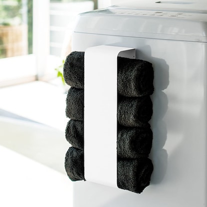 洗濯機に強力マグネットでくっつけられるバスタオル収納に便利なホルダー。場一般的なバスタオルが3枚〜4枚収納可能。洗濯機に収納スペースが作れるなんて何て画期的なアイディア商品かと感動しました。